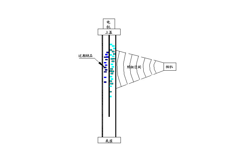 将柱内立体圆柱空间分布按功能进行划分,将参考样布置于柱内左侧后方,将测试过的过期样品有系统自动在每次清理后推至柱后侧区域,而柱正面全部留给当前有效样品使用。